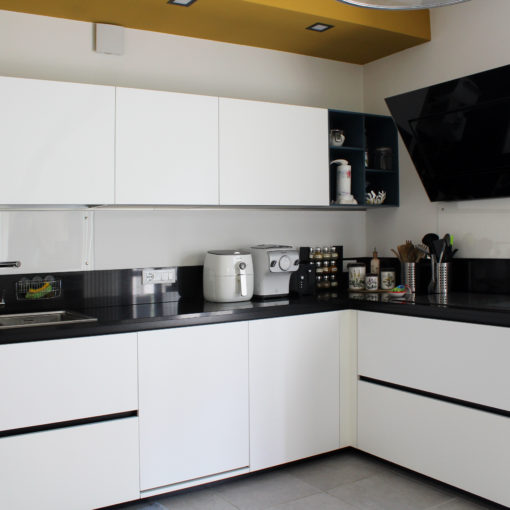 L’esigenza del cliente era quella di trovare il modo di avere una separazione della zona tv rispetto alla zona pranzo che però non risultasse una netta divisione. Altra richiesta era quella di avere un tavolo che richiamasse il colore dei serramenti e che avesse una struttura il più leggera possibile per risaltare la veneziana. Abbiamo deciso di studiare una struttura in vetro che ci desse allo stesso tempo stabilità e leggerezza dando quasi il senso che il piano fosse sospeso. La divisione delle due zone è data da un elemento in cartongesso con pittura effetto cemento nel quale viene integrata la panca. Lo stesso elemento specchiato a soffitto ci ha permesso di andare ad inserire la barra led per poter creare un effetto luce di scena. Le pitture usate in questo progetto sono molto audaci mentre i colori dei mobili, per equilibrare il tutto, rimangono sui toni dei bianchi e della tinta legno simile ai serramenti esistenti.